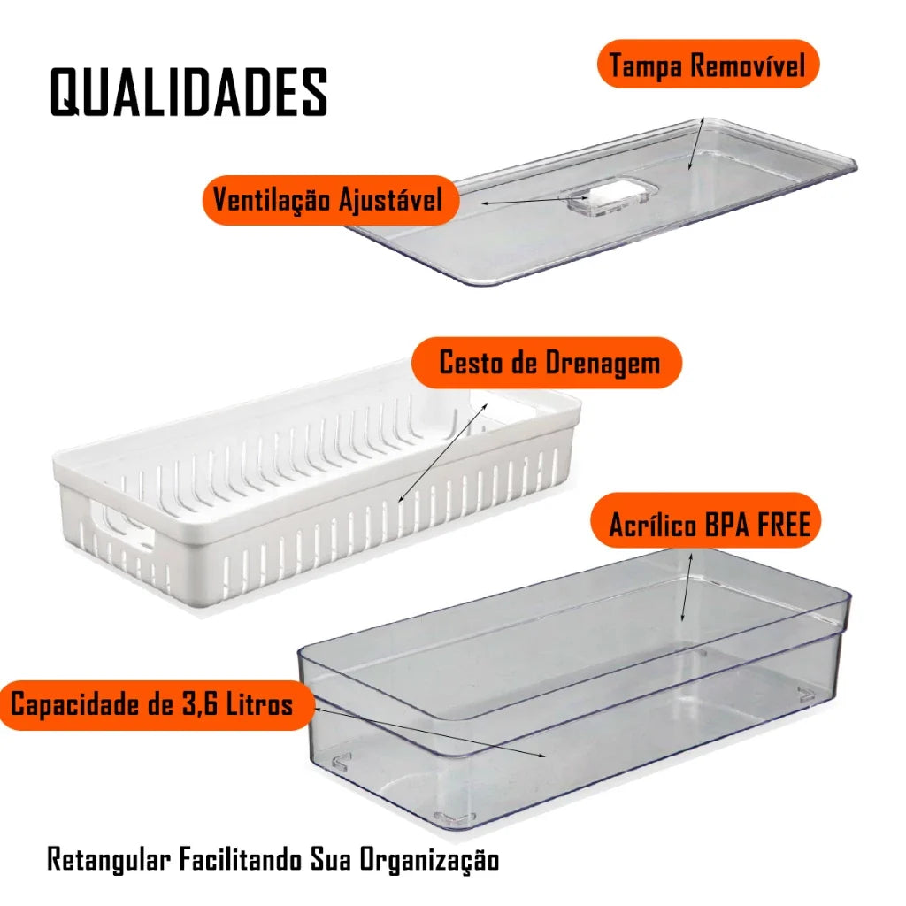 - Frescor Prolongado: Equipado com um cesto de drenagem que assegura fluxo de ar, mantendo os alimentos frescos por mais tempo.