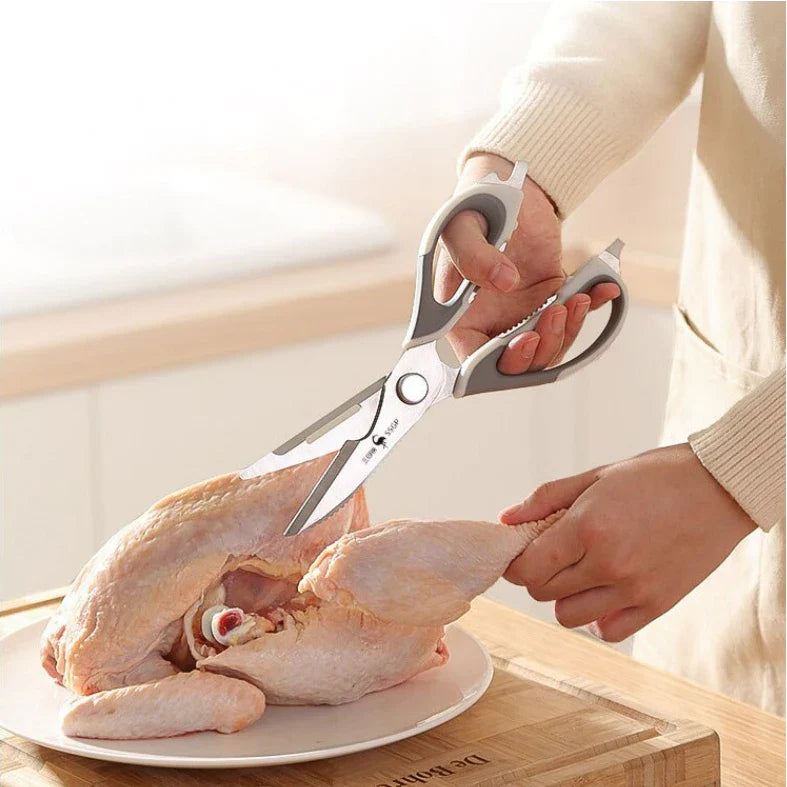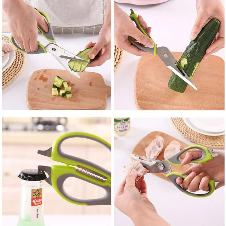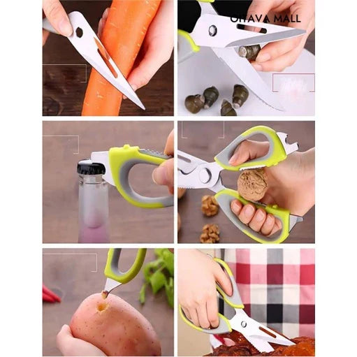 - 10 Funções em Uma Só Tesoura: Este modelo multifuncional ainda inclui funções extras como abridor de tampa de garrafa, chave de fenda, quebra nozes, descamador de peixe, lâmina de faca, cortador de ossos, descascador de legumes e muito mais.